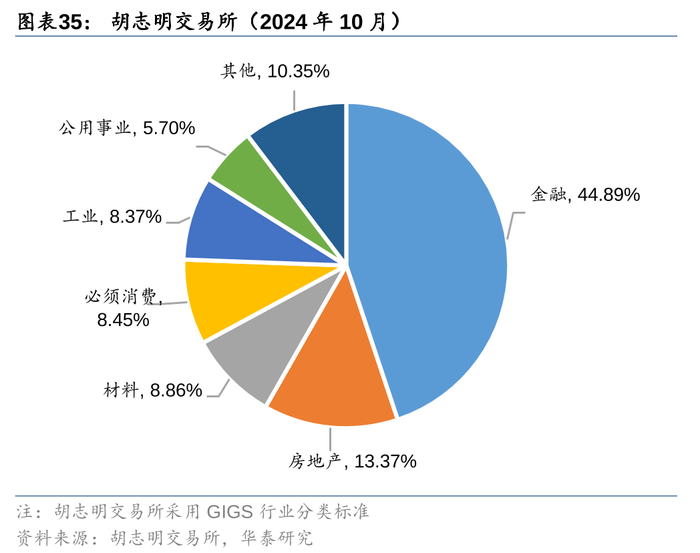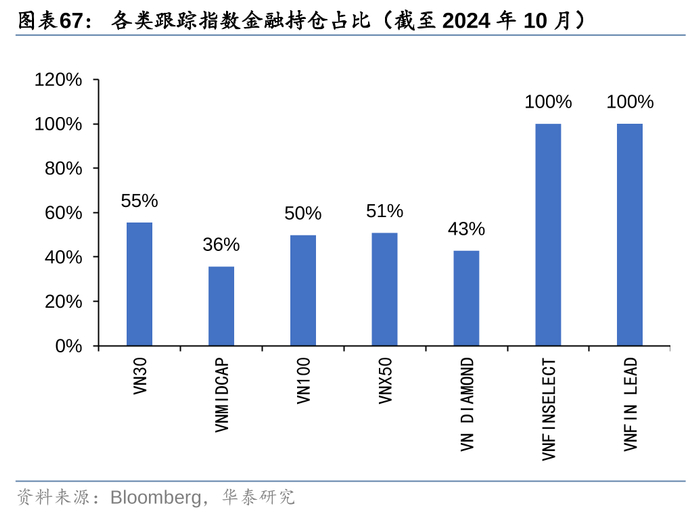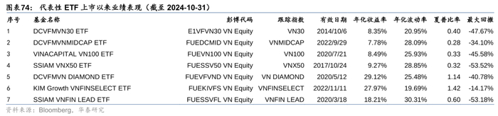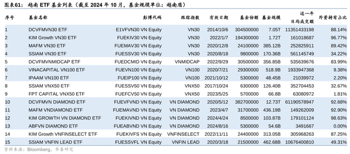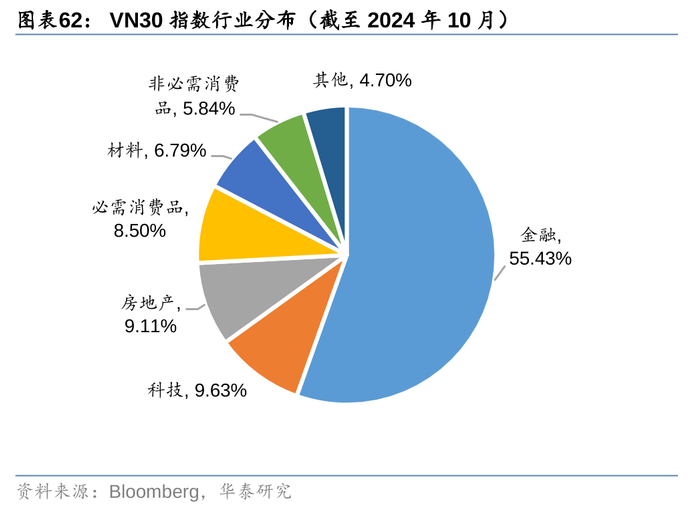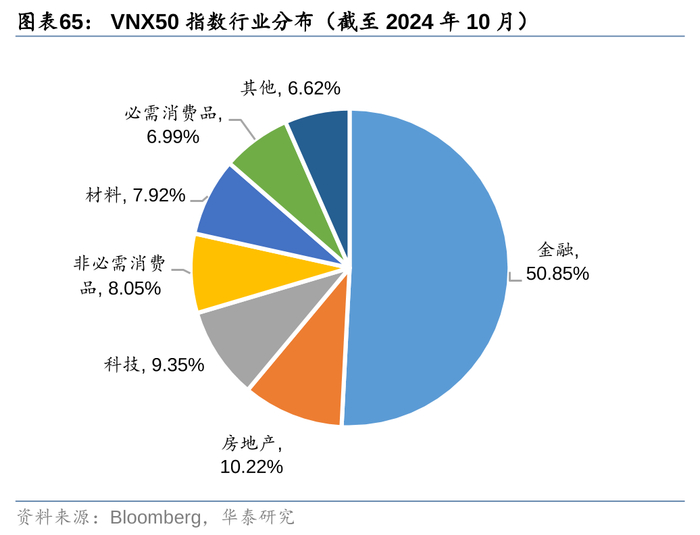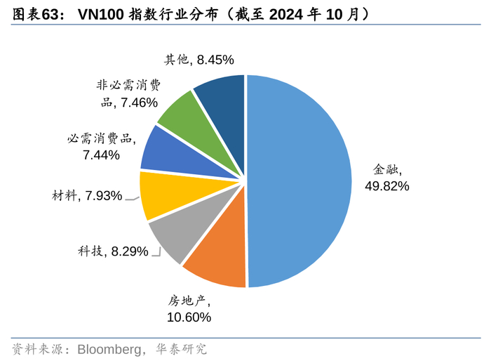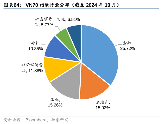 3. VNFINSELECT和VNFIN LEAD均是以胡志明交易所金融板块成分股为样本空间,选取市值、流动性靠前的股票,用以表征越南金融行业的走势。这主要是因为胡志明交易所上市公司行业构成中,金融行业市值占比近45%(截至2024年10月),是第一大行业,因此其成分股的可交易性更强,更适合构建行业ETF产品。
