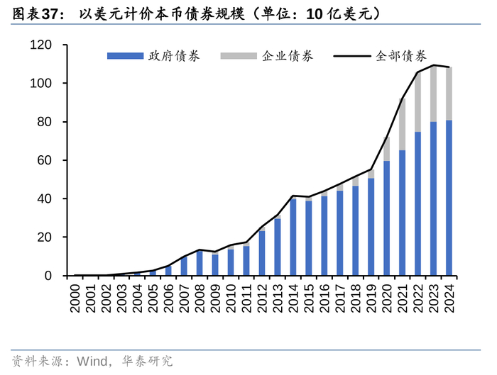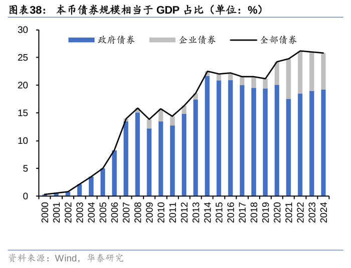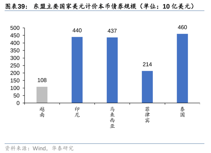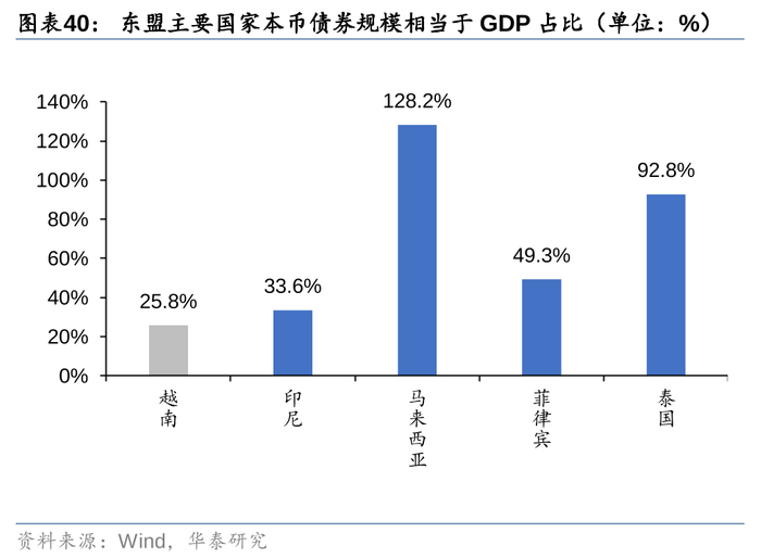过去20多年,越南债券市场几乎是从零起步,经历了显著稳步发展。本币债券规模在2024年二季度末达到 1084 亿美元,是2010年末的6.77倍,年复合增长率为13.3%。本币债券占 GDP 的百分比为 25.8%,较 2010 年末提升10.5pct。与泰国、马来西亚等东盟其他发展中国家相比,越南本币债券规模无论是绝对值,还是占 GDP 的百分比,都相对落后,未来仍有较大的增长空间。