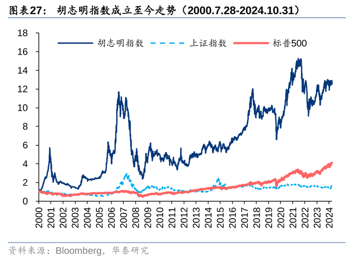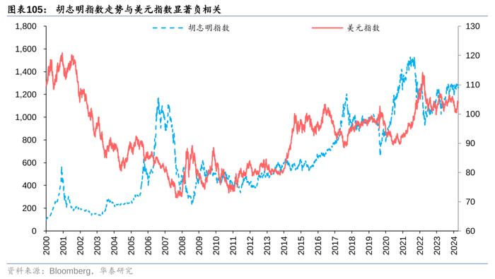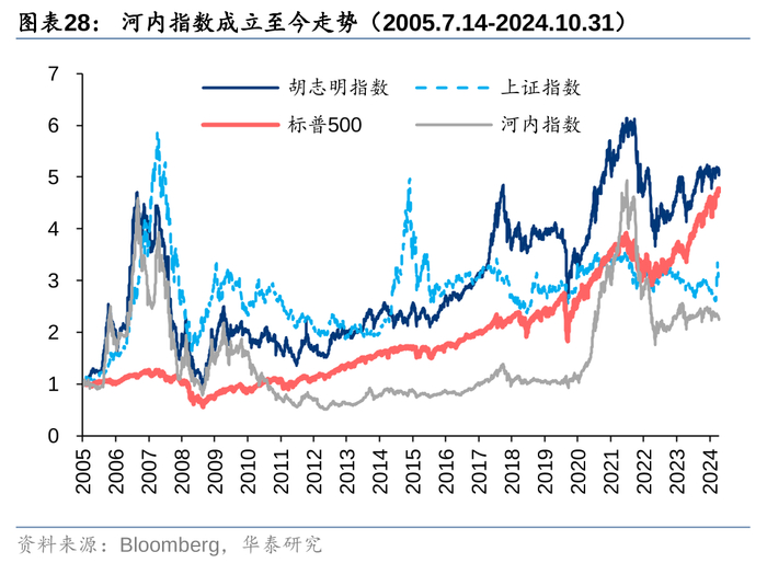 4.资金流出风险:越南作为开放程度高的新兴市场,容易受到全球热钱追捧,一旦热钱流出,将不利于越南股市。对比胡志明指数和美元指数的历史走势,两者之间存在显著的负相关,尤其是美联储大幅加息的2022年,胡志明指数下跌32.78%。