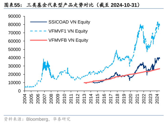 现存开放式基金均是以超越基准表现为目标的主动管理型基金,其中,成立最早的是DC Dynamic Securities Fund,成立于2004年5月20;规模最大的是Vietnam Select Equities Investment Fund,最新规模59200亿越南盾,约2.3亿美元。其他比较有特色的基金还包括聚焦于ESG投资理念的United Vietnam ESG Equity Fund。