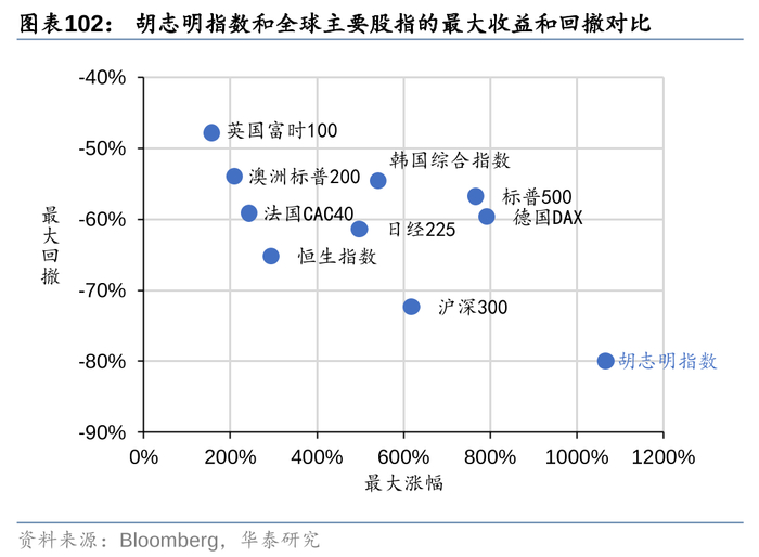 2.市场有效性风险:越南股市机构化程度不足,散户占比高,可能导致市场波动大,容易涨过头或跌过头。目前越南股市投资者结构中,个人账户数量占比超过99%,并且2021年以来,个人账户数量还在快速增加,“散户化”特征显著。而散户投资者往往容易受到市场情绪的影响而追涨杀跌,这在一定程度上会降低市场的有效性。自2002年以来,胡志明指数的最大回撤和最大涨幅都要高于发达国家主流股票指数。