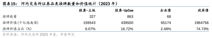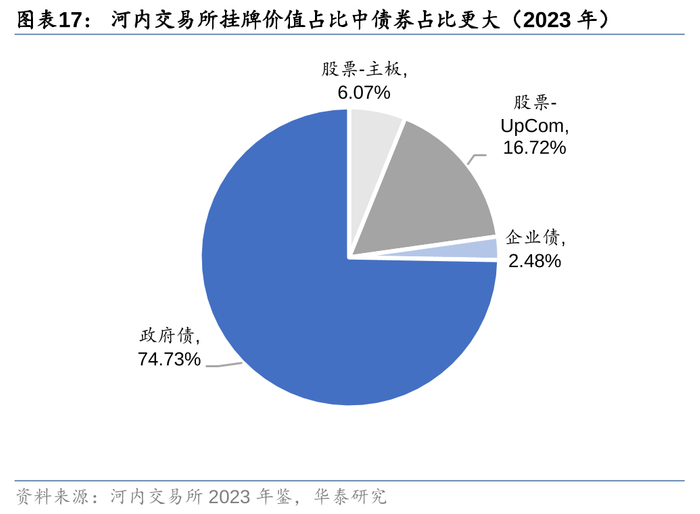 河内交易所是越南的第二大证券交易所,下辖主板市场和UpCom市场,其中主板市场以较低的上市要求承接中小型企业上市,而UpCom市场则是河内交易所的特色,其定位类似我国新三板,以更低的挂牌和披露要求为非上市公司提供交易股票、可转债的平台,同时也服务于筹备主板上市的公司及主板退市公司。除股票之外,河内交易所的产品还有债券(以政府债券为主)、衍生品等。根据河内交易所2023年年鉴,无论是挂牌价值占比,还是交易金额占比,政府债都超过70%,占主导地位,而河内交易所的主要职责之一就是承担政府债券招标。