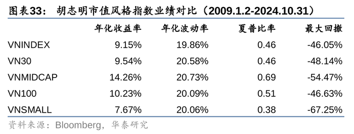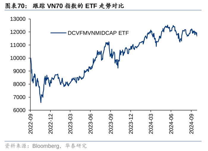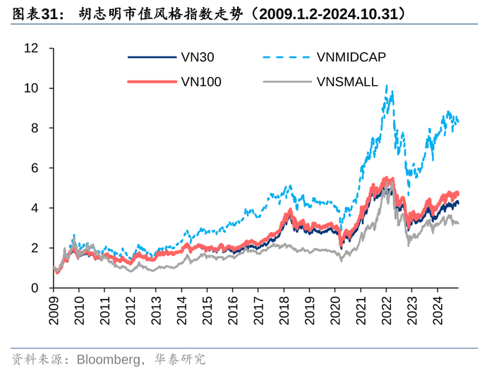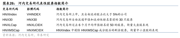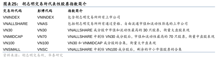1. VN30、VN100、VNMIDCAP均是胡志明交易所发布的宽基指数,其中,VN30和VN100指数分别包含胡志明交易所市值和流动性排名前30、100的股票,VNMIDCAP(彭博代码VN70)则包含VN100剔除VN30成分股后,剩余的70支股票。