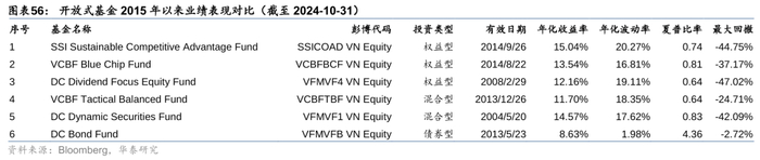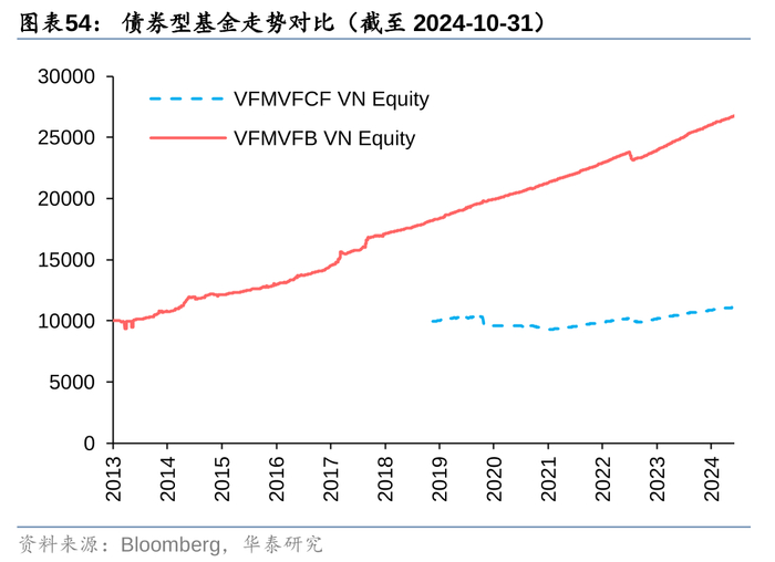 分类对比不同投资类型下基金的表现,其中,债券型基金内部,VFMVFB VN Equity成立时间更早、规模更大、业绩更优;混合型基金内部,VFMVF1 VN Equity同样在成立时间、规模和业绩表现上领先;权益型基金内部不同考察区间下业绩表现互有优劣,综合成立时间、规模和费率来看,SSICOAD VN Equity相对占优。