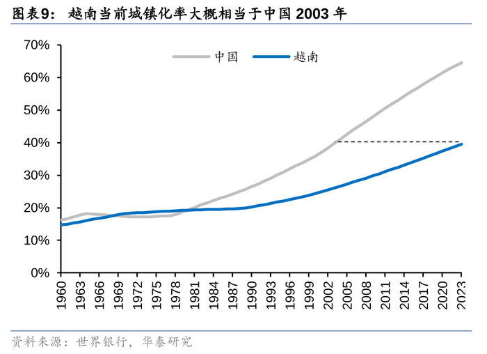 充沛的劳动力叠加相对廉价的人力成本,人口红利成了越南在全球化浪潮下接收、发展制造业的核心竞争力,而城镇化率的提升则为人口红利的释放提供了出口。自1960年有统计数据开始,越南城镇人口不断增加,城镇化率也一路攀升。截至2023年,越南城镇化率达到39.48%,大致相当于中国2003年的水平(39.78%),相比其他亚洲国家也处于较低水平,未来城镇化的潜力依然较大,越南的人口红利优势也将持续释放:一方面,城镇化规模的扩大、人口集中度的提升,有利于发挥劳动力的聚集效应;另一方面,城镇人口的增加,也能为服务业的发展提供更广阔的空间。