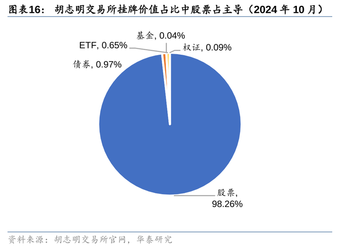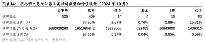 胡志明交易所是越南的第一大证券交易所,上市证券品种包括股票(以大型蓝筹股为主)、债券(以企业债为主)、基金、ETF、权证。截至2024年10月,无论是挂牌价值占比,还是交易金额占比,股票都超过90%,占据绝对主导。