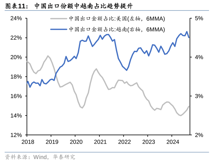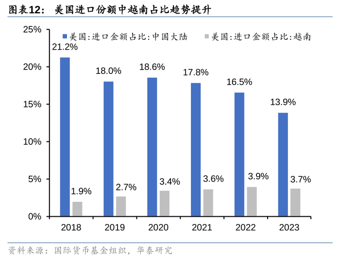 自2018年以来,越南在中国出口和美国进口中的份额占比不断上升,这从侧面说明越南在国际贸易体系中的重要性不断提升。如果越南能借本轮产业重构的机会完成工业化和产业升级,或许能给经济增长注入更持久的动力。