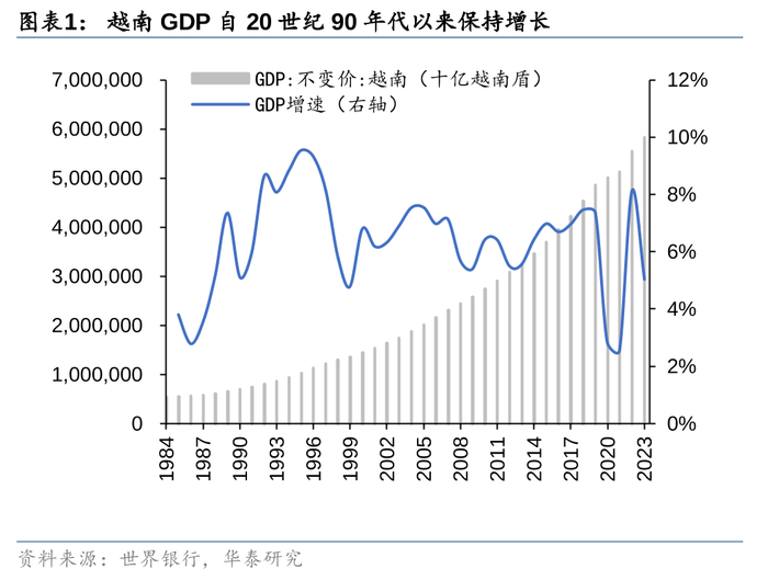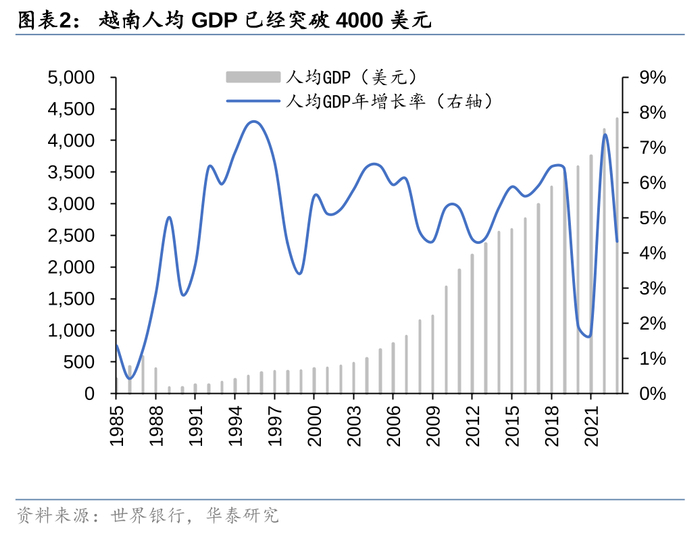 1986年12月,越南共产党召开第六次全国代表大会,大会决定把党的工作重点转移到经济建设上来,确立了革新开放总路线。此后越南经济快速增长,自1987年以来GDP年复合增速6.5%,人均GDP从最低1989年的不足100美元攀升至2023年的4347美元。