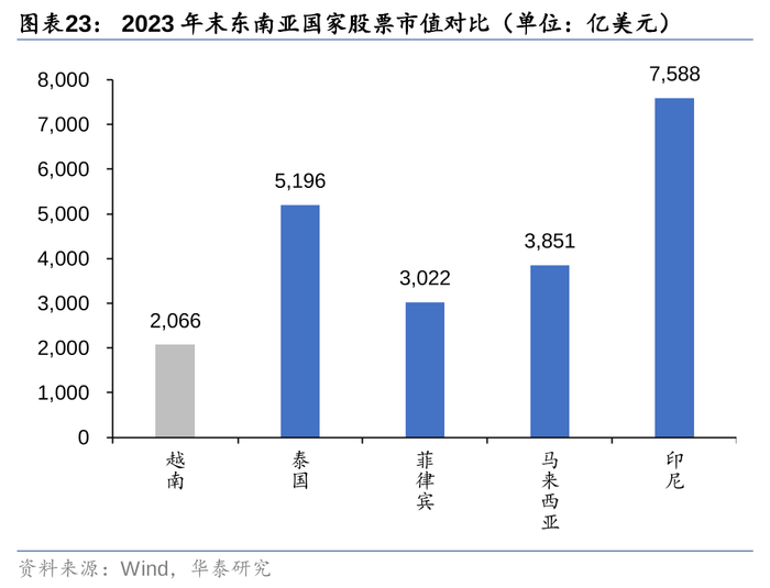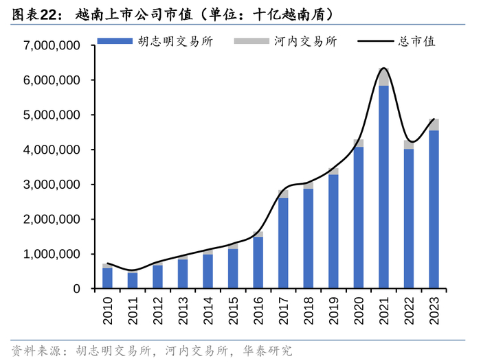 随着上市公司数量扩容,以及经济增长带来的盈利能力提升,股票总市值也逐步抬升。截至2023年末,越南上市公司总市值为48824610亿越南盾(约2066亿美元),相比2010年末增长了近6倍,但是对比同期泰国、菲律宾、印尼、马来西亚的股票市值仍有差距,这也说明越南股市未来或有较大的增长空间。