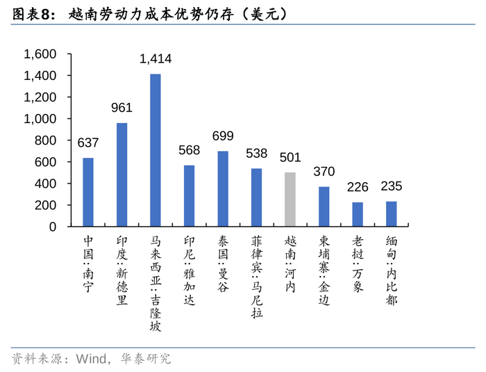 在市场化因素和非市场化因素的共同影响之下,全球产业链重构的趋势愈发显著,而越南则凭借自身独特优势,在本轮产业重构中占得先机:1、地缘区位优势凸显,越南北部临近中国华南,中越两国间已有 9条国际运输通道,便于原材料及零部件运输,东边海岸线狭长、港口众多、海运便捷,为国内商品出口创造了优越的条件;2、政治体制与文化习俗与中国相似,越南也是共产党领导的社会主义国家,儒家思想和东方价值观在越南社会意识形态中占据主导地位,诸多相似之处也降低了产业重构可能产生的摩擦成本;3、越南签署的多项贸易协定提供了关税优势和市场准入便利,降低了越南制造的成本,吸引了多国制造业产业链向越南转移。
