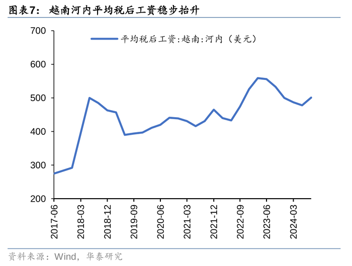 除了人口基数大、劳动力充沛之外,越南还具备劳动力成本相对低廉的优势。尽管2017年以来越南平均工资涨幅明显,但横向对比来看,劳动力成本仍具优势。最新数据显示,越南河内平均税后月工资为501美元,不及相邻的中国南宁市,也低于同属东南亚的马来西亚、泰国、印度尼西亚、菲律宾等国。