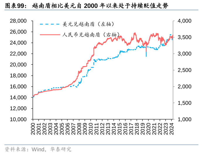 1.汇率风险:投资越南股市的一个重要因素是汇率,若越南盾大幅贬值,即便投资的股票是上涨的,最终账户也可能是亏钱的。自2000年以来,越南盾相比于美元和人民币整体都呈现出贬值走势,换算成美元计价、人民币计价后,胡志明指数的走势都要弱于原口径。