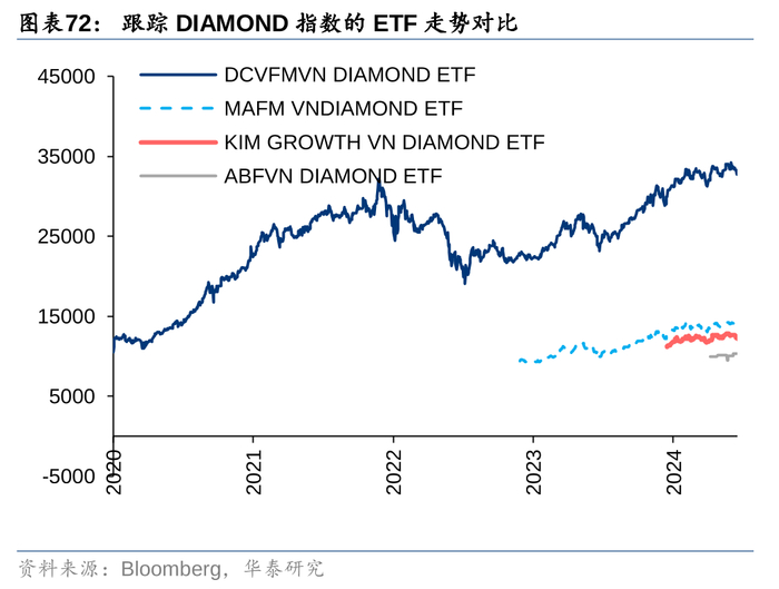 考虑到ETF基金以跟踪指数表现为目标,所以同一指数内部,我们按照成立时间、规模、流动性、外资持有占比综合评估,各选择了一只ETF作为跟踪对应指数的推荐标的,分别是跟踪VN30指数的DCVFMVN30 ETF、跟踪VN100指数的VINACAPITAL VN100 ETF、跟踪VN70指数的DCVFMVNMIDCAP ETF、跟踪VNX50指数的SSIAM VNX50 ETF、跟踪VN DIAMOND指数的DCVFMVN DIAMOND ETF、跟踪VNFINSELECT指数的KIM Growth VNFINSELECT ETF、跟踪VNFIN LEAD指数的SSIAM VNFIN LEAD ETF。其中,DCVFMVN DIAMOND ETF在不同考察区间业绩表现都排名靠前,两支金融行业ETF近2年来也提供了不错的回报。