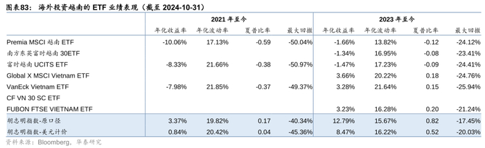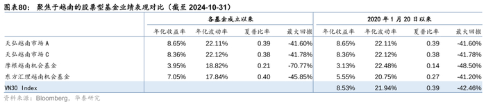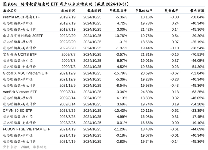 考察对齐区间后各ETF业绩表现,2023年以来美国上市的两个ETF相对更优。此外我们注意到,所有ETF成立以来都跑输胡志明指数,即便是剔除越南盾贬值的影响(也即和美元计价口径下的胡志明指数对比),ETF仍然跑输。这主要是受到越南股票市场对外资持股比例限制的约束(对于上市企业,外国投资者在证券交易市场限制持股比例最高为49%,除具体行业另有规定外),导致这些海外ETF无法配置某些触及外资持股上限的优质个股,或是无法配置足够的权重,影响了业绩表现。因此,投资者在通过海外ETF投资越南市场时,虽然省去了换汇的麻烦,但投资收益可能不如越南国内ETF(对比图表83和图表75、76),对此应客观看待。