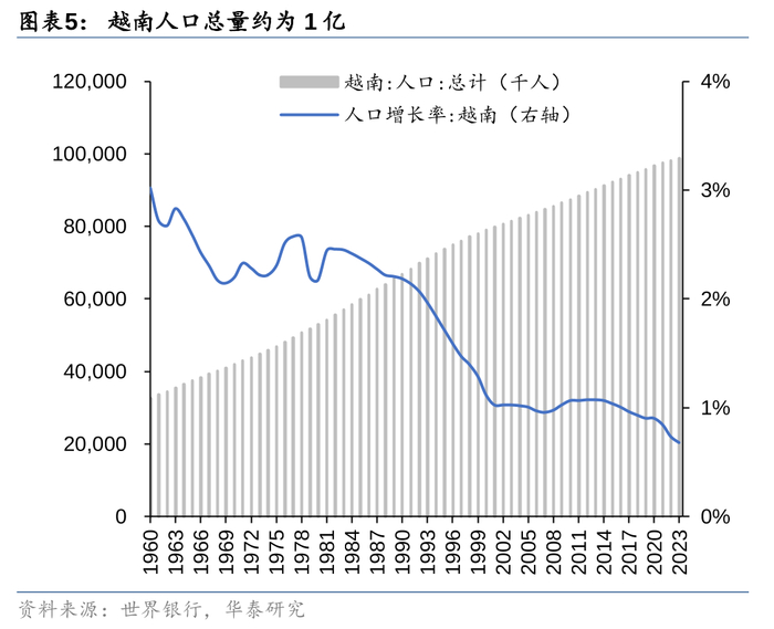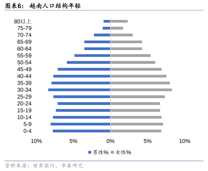 根据世界银行数据,2023年越南人口总量约为1亿,是世界第15大人口大国,在东南亚地区排名第三,仅次于印尼和菲律宾。并且越南年轻人口众多,其中15-64岁人口占比近70%,劳动力充沛。此外0-14岁人口占比也较大,能够成为未来数十年越南劳动力人口的重要来源与补充。