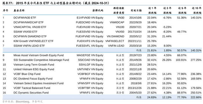 对比ETF和主动型股票基金不同区间的平均业绩回报,可以看到主动基金相比于ETF有一定的超额收益,但是主动基金研究难度高,数据获取渠道匮乏,而ETF具备费率低、规则透明的优势,因此我们更建议投资者采用ETF的方式投资越南股市。