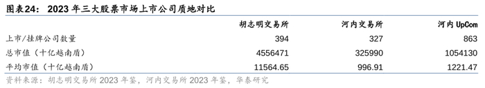 从上市公司质地来看,胡志明交易所以大型蓝筹股为主,2023年末平均市值115646.5亿越南盾(约5亿美元),河内交易所则以中小型公司为主,平均市值不及前者的十分之一。而UpCom市场的非上市企业,平均市值略高于河内主板市场,也以中小型公司为主。
