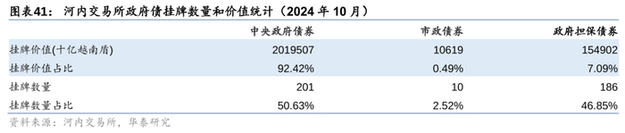 越南债券市场分为场外交易市场(OTC)和交易所市场两部分。企业债券有小部分在胡志明市交易所和河内交易所挂牌交易,但大部分仍然在场外交易市场进行交易(根据2023年底数据,两大交易所挂牌的企业债券规模总计33亿美元,而企业债券总规模为295亿美元,场内市场挂牌交易的金额占比仅略高于10%)。政府债券(包括中央政府债券、政府担保债券和市政债券)则统一在由河内交易所运营的政府债券市场进行挂牌交易。截至2024年10月,政府债挂牌金额21850280亿越南盾,约890亿美元,其中又以中央政府债券为主,占比超90%,是投资者主要的债券交易标的。