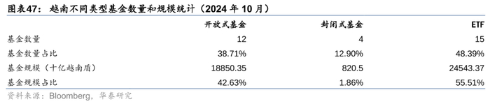 截至2024年10月,越南一共有31支基金产品,其中包括12支开放式基金、4支封闭式基金以及15支ETF。总基金规模为442142.2亿越南盾,约合17.5亿美元,其中开放式基金、封闭式基金以及ETF基金对应的总规模分别为188503.5亿、8205亿、235433.7亿越南盾,规模占比分别为42.63%、1.86%、55.51%。可见,无论是从数量占比,还是规模占比来看,越南最重要的基金投资类型都是ETF,其次是开放式基金,封闭式基金相对落后。