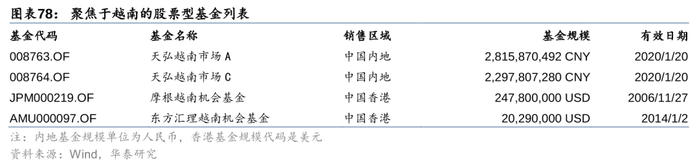 2. 摩根越南机会基金和东方汇理越南机会基金均是香港地区销售的两支主动管理型股票基金,它们不仅会投资越南上市公司,也会考虑其他在越南收入/资产占比较高的公司,比如东方汇理越南机会基金最新一期持仓中,就包含了三星电子。