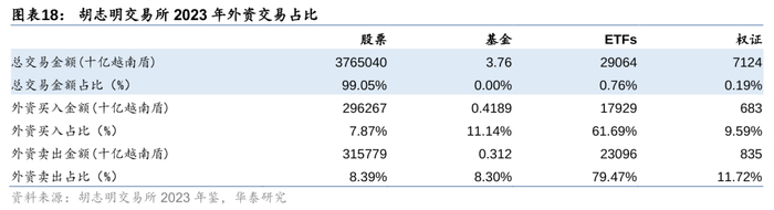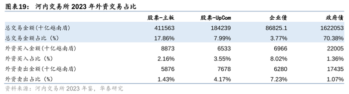 越南证券市场近年来在国际化方面取得显著进展,吸引了大量外国投资者的关注。2023年年,胡志明交易所的四大类投资品种中,外资买入、卖出金额占总交易金额的比例都在7%以上,其中ETF的买入卖出金额占比更是超过60%,说明ETF是外资介入越南股市的重要工具。相较之下,河内交易所中外资的参与程度稍低,股票主板买卖金额占比都在3%以下。