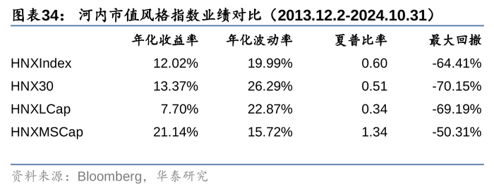 分别对比胡志明交易所和河内交易所市值风格指数成立以来的表现,其中,胡志明交易所中等市值指数的业绩表现更好,两端的大市值和小市值则相对偏弱;而河内交易所中,小市值风格指数业绩弹性更大。