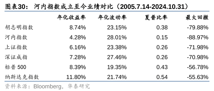 分别对比胡志明指数和河内指数成立以来,越南主板指数和中、美主板指数的表现。在年化收益率方面,胡志明指数排名都相对靠前,但同时也要注意到,越南股市作为一个新兴市场,其波动和回撤都要高于以标普500为代表的美股指数。