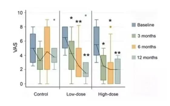 下图中可以看出通过了间充质干细胞治疗的,不论是低剂量组或者是高剂量组,VAS评分(疼痛指标)都是下降的