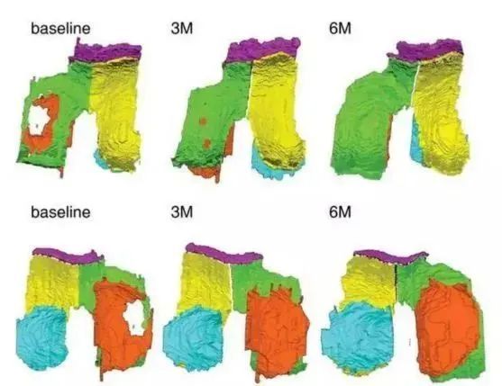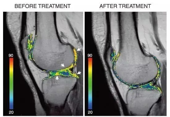 下图所示,颜色越红代表软骨质量越差。可以看出治疗前(左边)的软骨大部分是黄色,治疗后蓝色明显偏多,表示间充质干细胞治疗后软骨质量增加。