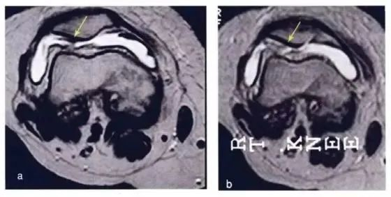 下图a示意治疗前软骨,b为治疗后6个月软骨,箭头所示为软骨修复位置。