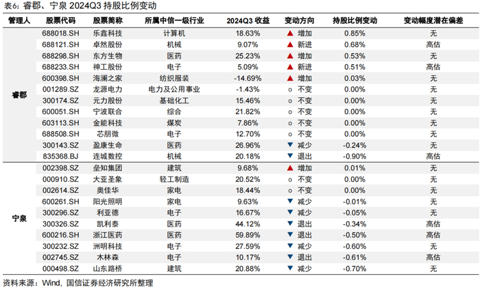 2024Q3宁泉提高了垒知集团的持股比例,并降低了山东路桥、木林森、洲明科技、浙江医药、凯利泰等股票的持股比例。