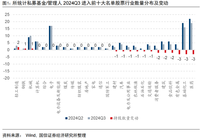 相比于2024Q2,2024Q3私募管理人进入轻工制造、机械、钢铁前十大名单的股票数量最多,从医药、有色金属、基础化工前十大名单撤离的私募管理人最多。