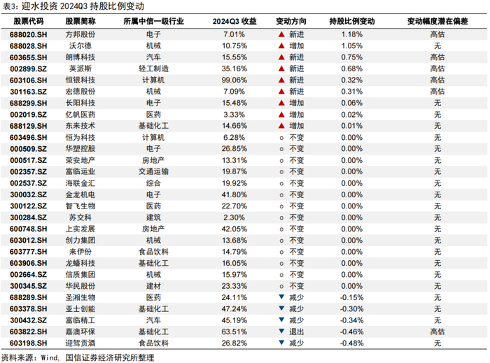 2024Q3迎水提高了方邦股份、沃尔德、朗博科技、英派斯、恒银科技等股票的持股比例,并降低了迎驾贡酒、嘉澳环保、富临精工、亚士创能、圣湘生物的持股比例。