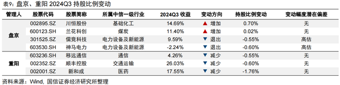 2024Q3盘京提高了川恒股份、兰花科创的持股比例,并降低了神马电力、儒竞科技的持股比例。