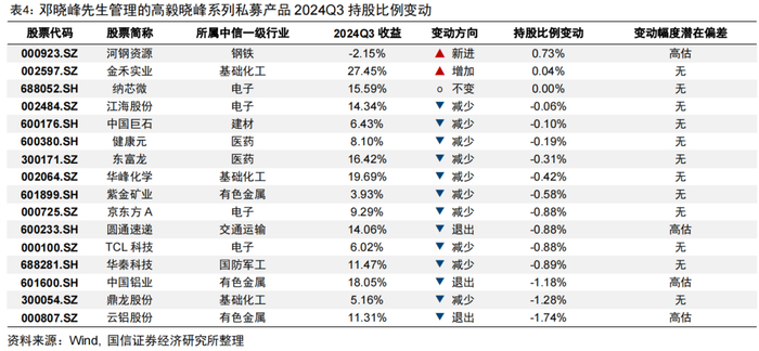 2024Q3邓晓峰(高毅晓峰系列产品)提高了河钢资源、金禾实业的持股比例,并降低了云铝股份、鼎龙股份、中国铝业、华秦科技、TCL科技等股票的持股比例。
