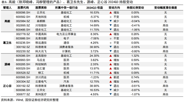 2024Q3葛卫东提高了中晟高科的持股比例,并降低了科大讯飞、科德教育的持股比例。2024Q3源峰提高了龙高股份、马应龙、羚锐制药、达仁堂、柳工的持股比例。