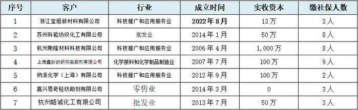 从上表可见,这些前五大客户,本应大量出现的纺织或印染企业客户却并未出现。从行业性质看,涉及制造的也仅为1-2家;从社保缴纳人数看,均可能不足10人;从实收资本来看,最高的杭州斯隆材料科技有限公司为1,000万元,其余均小于等于100万元;从成立时间来看,上表中的浙江宝旭新材料有限公司成立不到4个月就成为发行人2022年度第三大客户。