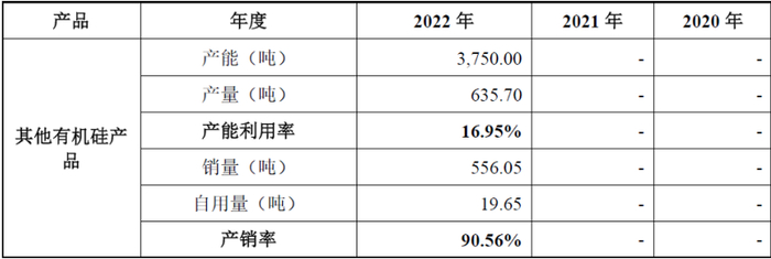 上述项目应该对应发行人收入表中的其他,也即发行人的有机硅新产品,但招股书披露的其他有机硅产品的产能、销量的情况,如下表所示: