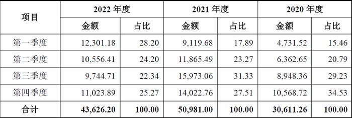 发行人披露的主营业务收入按季度分类情况,如下表所示: