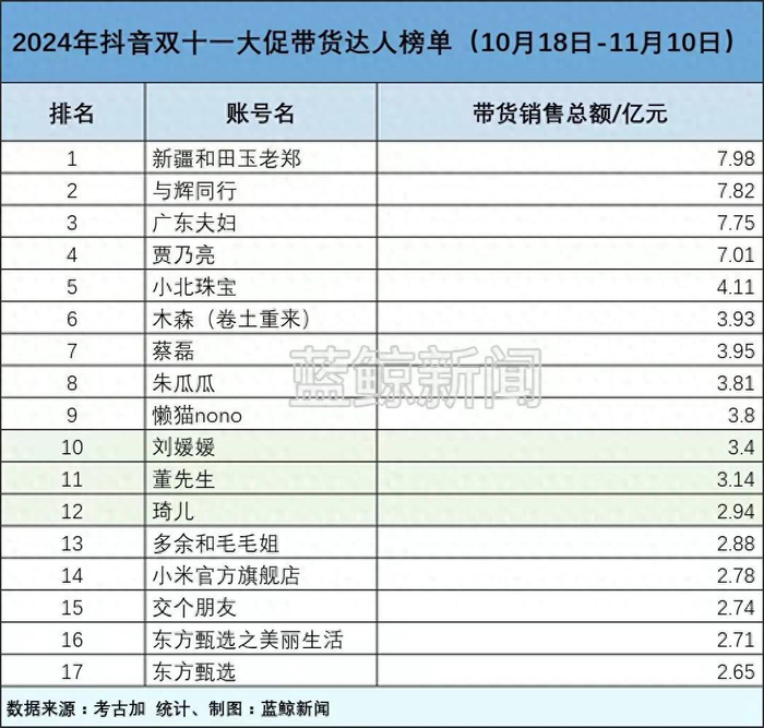 抖音双十一榜单:与辉同行第二,东方甄选未进前十