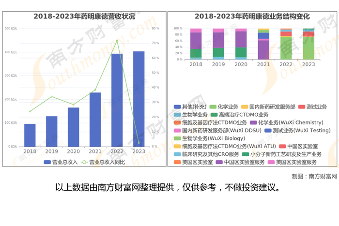 药明康德于2018年5月8日在上海证券交易所上市,股票代码603259。公司主营业务为化学业务、测试业务、生物学业务、细胞及基因疗法CTDMO业务、国内新药研发服务业务。