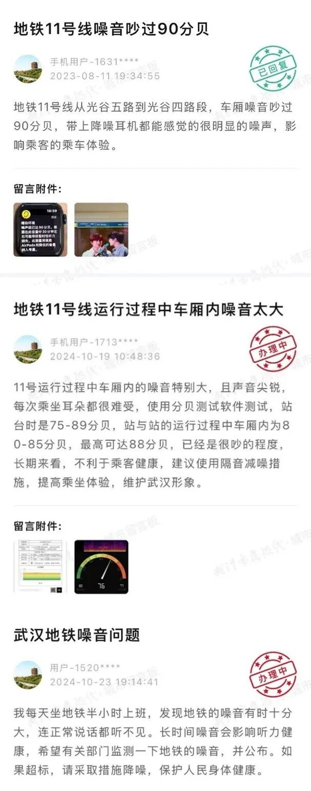 在武汉城市留言板上,记者查询到,也有市民对于地铁运行噪音发出了质疑。还有人配上了电子手表和软件测试的噪音数值,显示噪音已经超过了90分贝。
