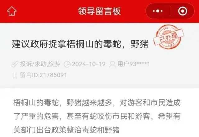 还有网友反映,梧桐山的毒蛇、野猪越来越多,对游客和市民造成了严重的危害,甚至有蛇咬伤市民和游客,希望有关部门出台政策整治毒蛇和野猪。