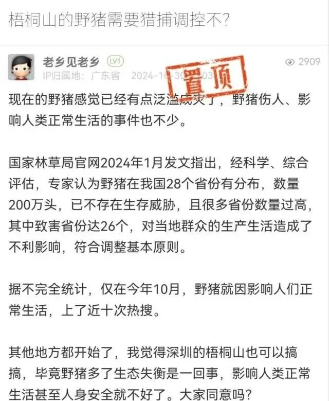 近日,有网友在论坛发帖提问,其他地方都开始对野猪进行治理了,梧桐山的野猪需要猎捕调控不?