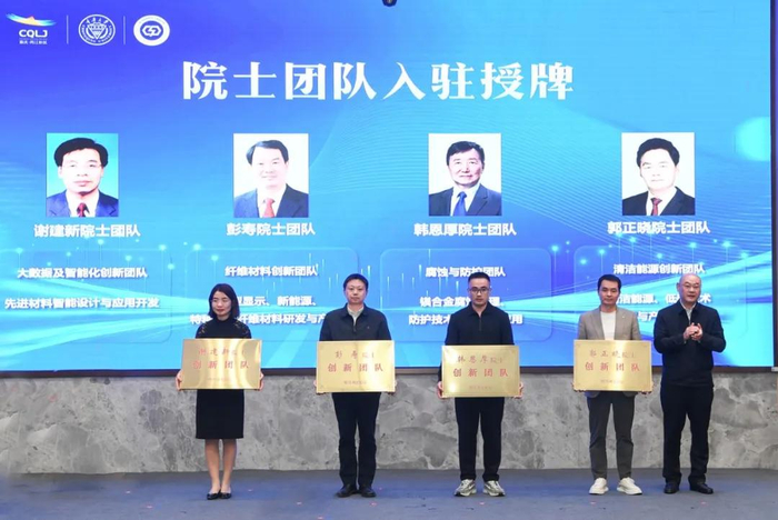 ▲ 重庆两江新区党工委副书记、管委会副主任徐宏球为明湖实验室引入的谢建新院士团队、彭寿院士团队、韩恩厚院士团队、郭正晓院士团队入驻授牌。