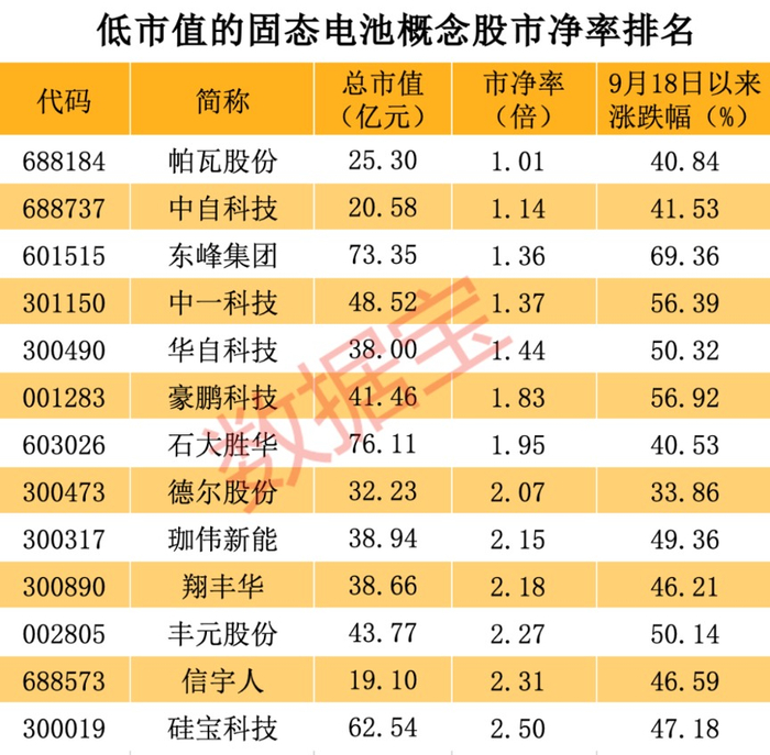 证券时报·数据宝统计出低市值低估值的固态电池概念股,未来弹性或较大。