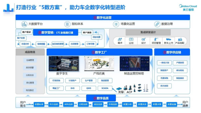 针对汽车行业存在的系统内部数据不拉通、价值链不透明等问题,美云智数主张全价值链审视业务痛点,依托美的最佳实践和行业沉淀,打造汽车行业“5数方案”,从数字工厂、数字营销、数字供应链、数字品质、数字化运营5大业务领域出发,全面提升核心竞争力。同时构建供应链控制塔提升整车厂的交付水平,输出灯塔工厂1000+智能应用场景提升智能制造水平,目前已广泛服务于东风汽车、广汽集团、上汽集团、长安汽车、零跑汽车、长城汽车、亚大集团、金龙客车、爱玛科技等整车和汽配企业。