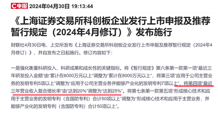 对此,今年4月,上交所公布的《上海证券交易所科创板企业发行上市申报及推荐暂行规定(2024年4月修订)》正式施行。其中明确要求强化衡量科研投入、科研成果和成长性的关键指标。