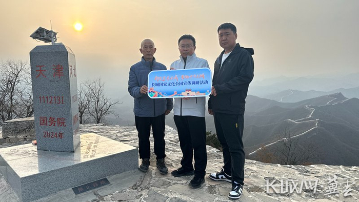 11月11日,“行走万里长城 见证中华文明”——长城国家文化公园宣传调研活动走进天津市蓟州区前干涧村。前干涧村党支部书记刘志军(右一)和前干涧村长城保护员卢学艳(左一)在京津冀Ⅰ号“三界碑”旁举起活动标识牌。