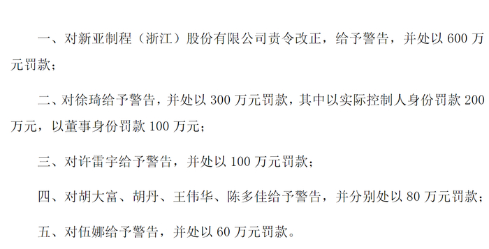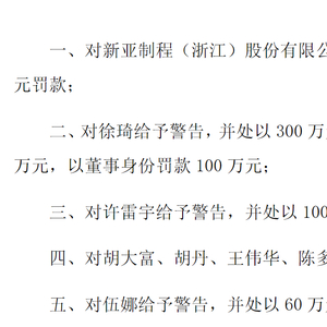 《行政处罚事先告知书》显示,新亚制程涉嫌存在未按规定及时披露关联方非经营性资金占用、应收账款坏账准备计提不准确导致虚增利润总额等违法事项。浙江证监局拟决定对新亚制程责令改正,给予警告,并处以600万元罚款,对7位相关责任人给予警告,并处以60万元至300万元不等的罚款。